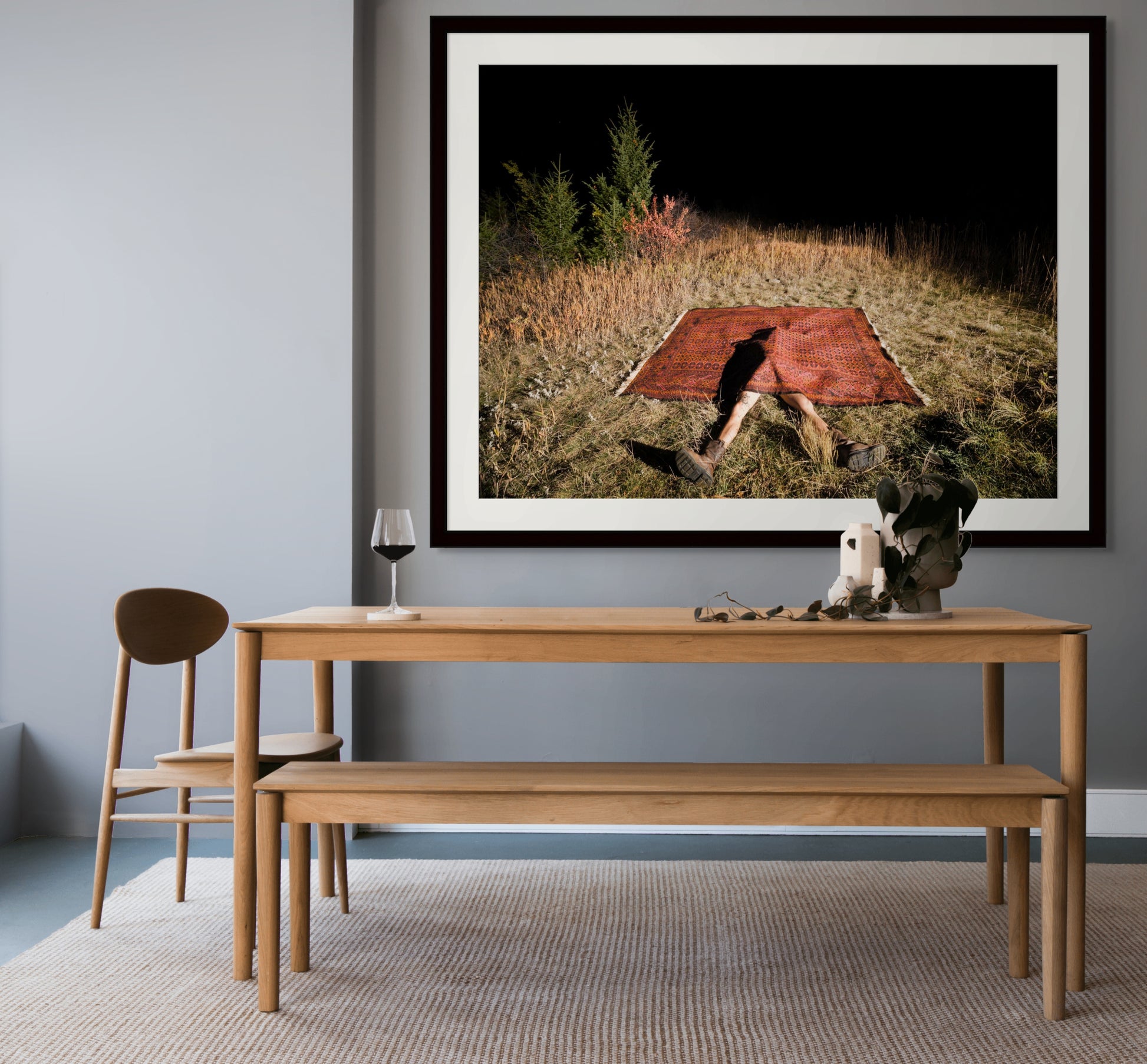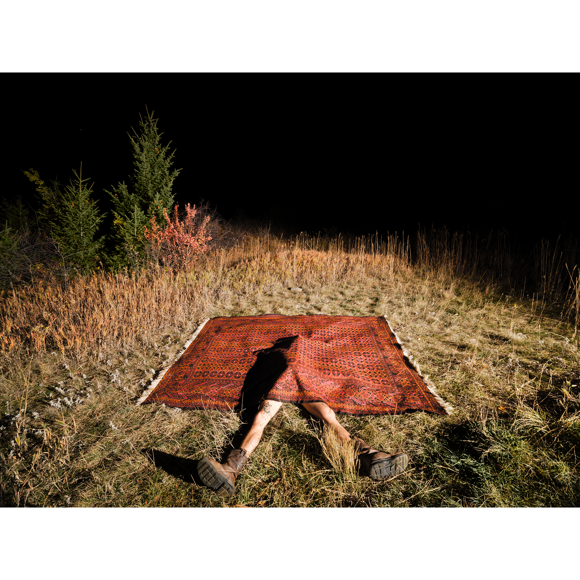 A figure lies face up beneath a heavy woven rug in a field. Boots confront the camera at an awkward angle.