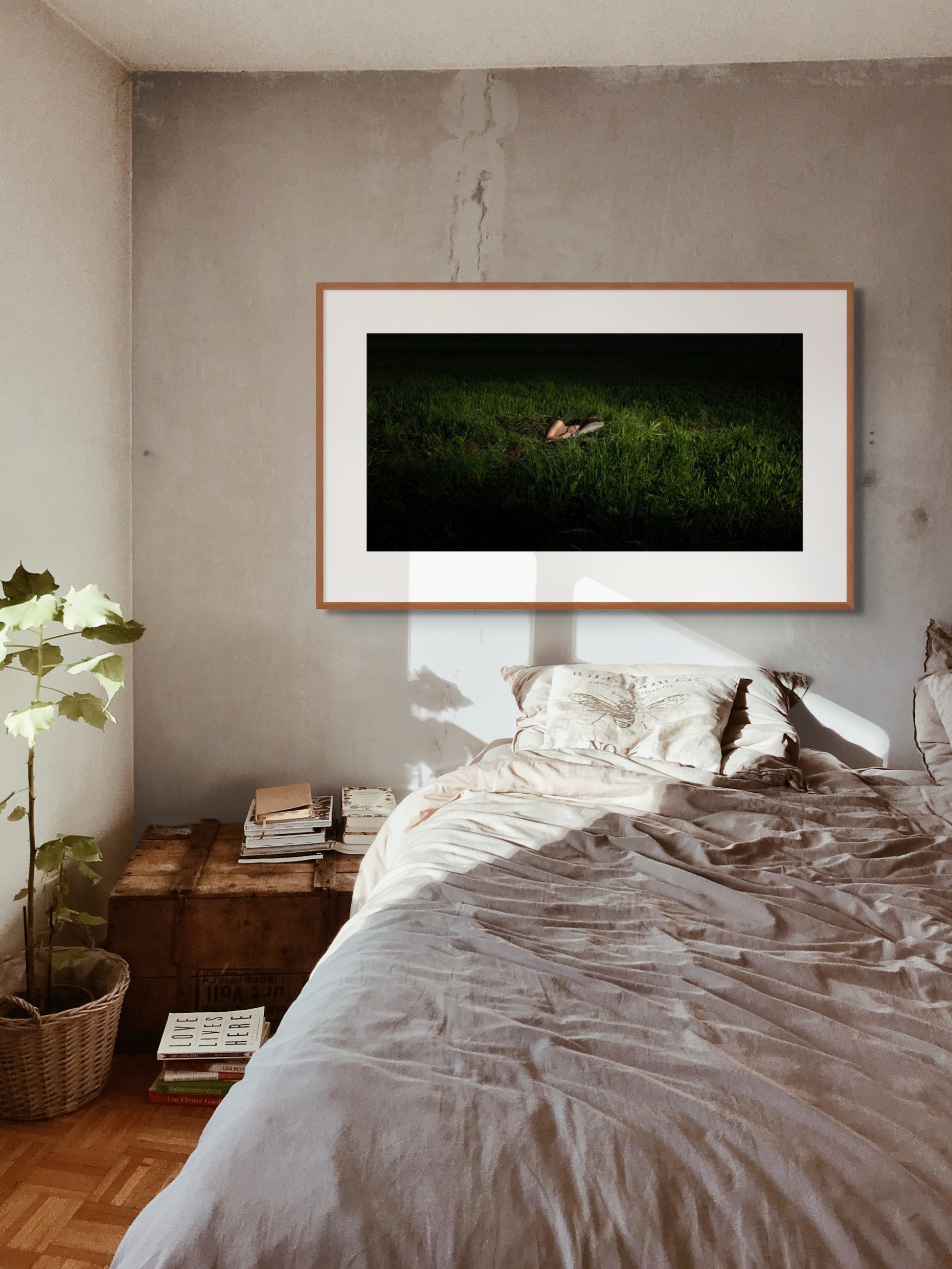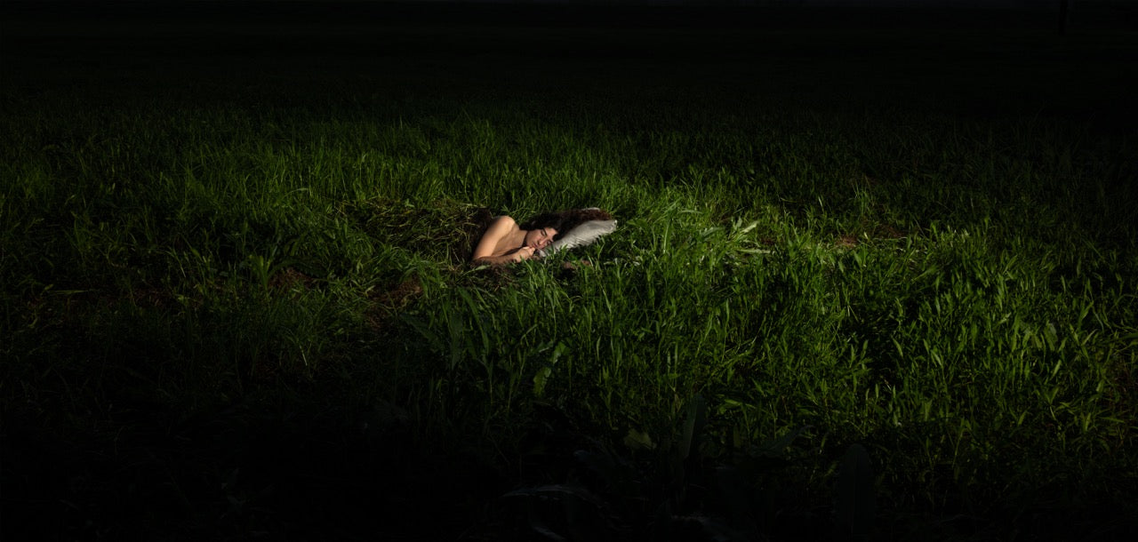 Bed of Grass merges domestic ritual with the primitive urge to burrow, staging a return to shelter that feels both instinctive and faintly ominous. The familiar gesture of tucking in slips toward something subterranean, ancestral, and unsure.