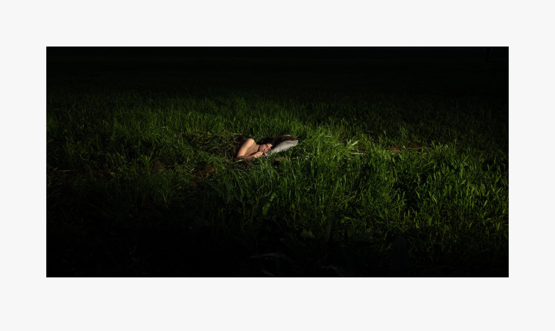 A blanket of grass folds back like a coverlet, revealing a damp, loamy hollow where a woman rests.